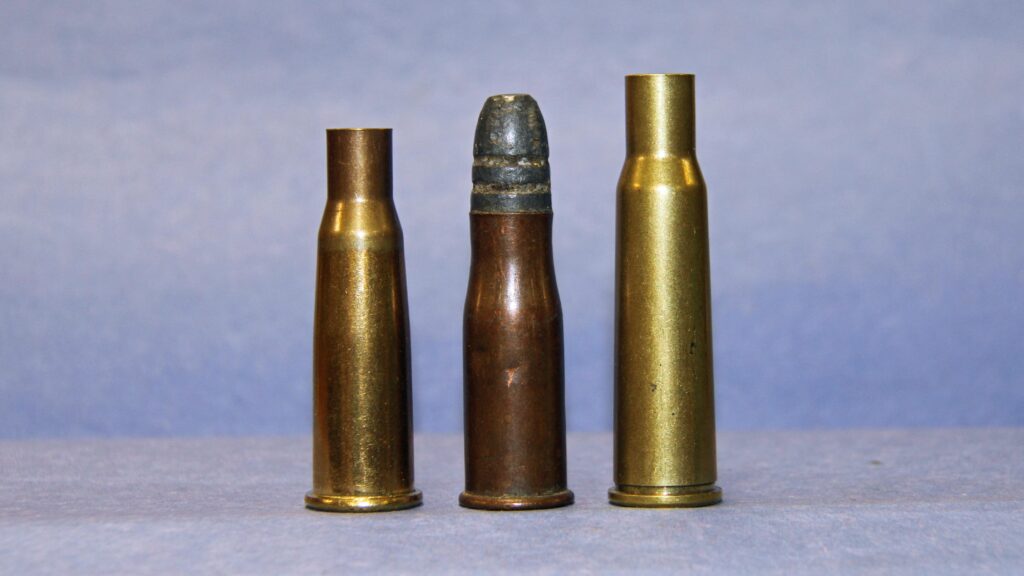 If the 348 Winchester is used, the base needs to be turned down just slightly to get it to chamber. This is not needed for the 8mm Lebel but it is less readily available, while the .348 Winchester is easier to source. Depending on what is available and the cost, either of these can be used.