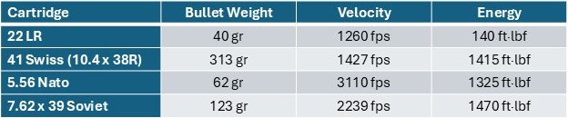 This rifle was, in many ways, ahead of its time with a chambering that produced an energy level comparable to current intermediate cartridges, rather than contemporary cartridges adopted by other nations, such as the 577/450 Martini-Henry. The 41 Swiss is a rimfire round but make no mistake, it is not a 22. The table below compares it to some other intermediate rounds as well as the 22 LR.