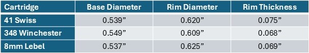 Making the brass is easy since it is possible to use either readily available 348 Winchester or less common 8mm Lebel brass as the starting point. The next table compares the two options. The information for the 41 Swiss came from UMC and Remington cases in my reference collection.